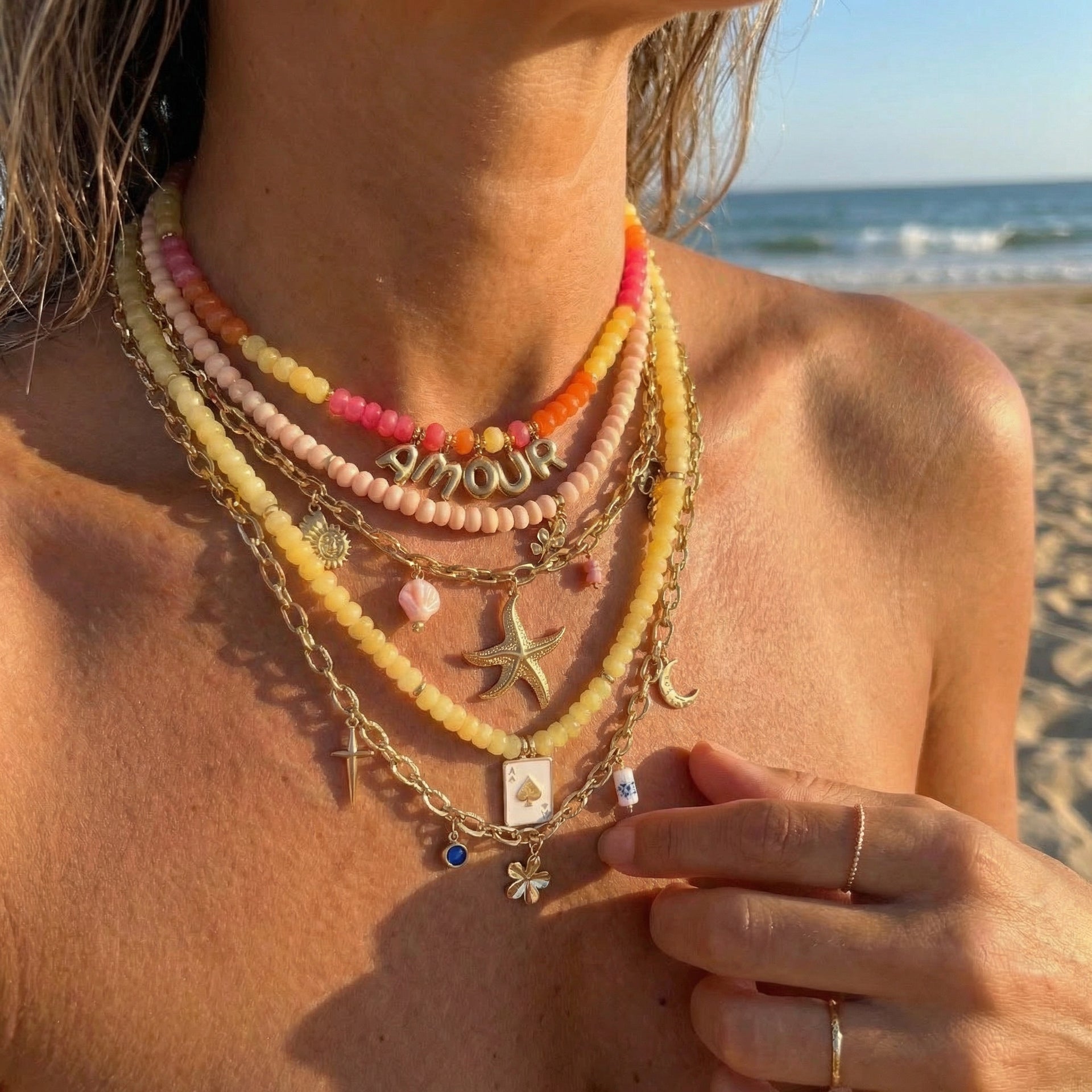 Our jewelry are crafted from durable stainless steel, designed to last through time without losing its shine. Each piece is carefully selected with patience and passion, celebrating vibrant colors, radiant tones, and a sun-kissed spirit.