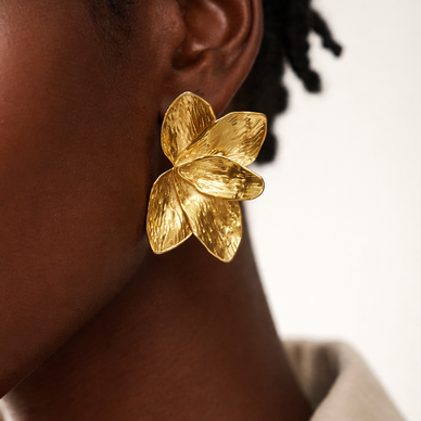 • Boucles d'oreilles florales tendance, confectionnées en acier inoxydable résistant avec une finition plaquée or 18 carats éclatante