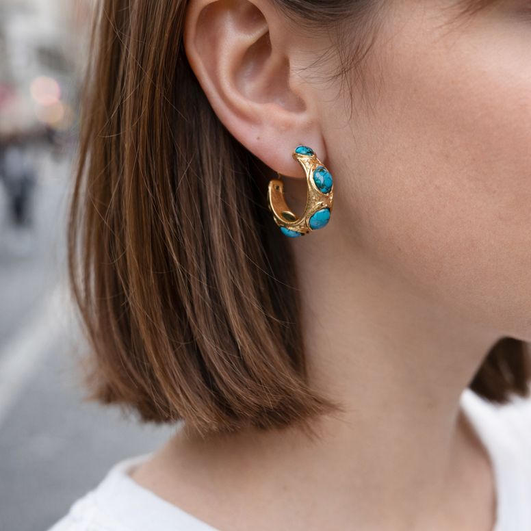 Sculptural hoop silhouette with smooth curves, beautifully framing the turquoise accents